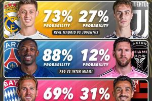 世俱杯足彩比分-世俱杯各队进8强概率:迈阿密12%垫底,尤文皇马37开,曼城83%